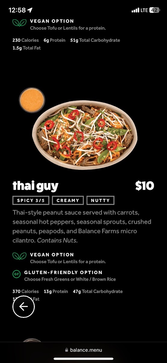 Thai-style peanut sauce served with carrots, seasonal hot peppers, seasonal sprouts, crushed peanuts, peapods, and Balance Farms micro cilantro. Contains Nuts.